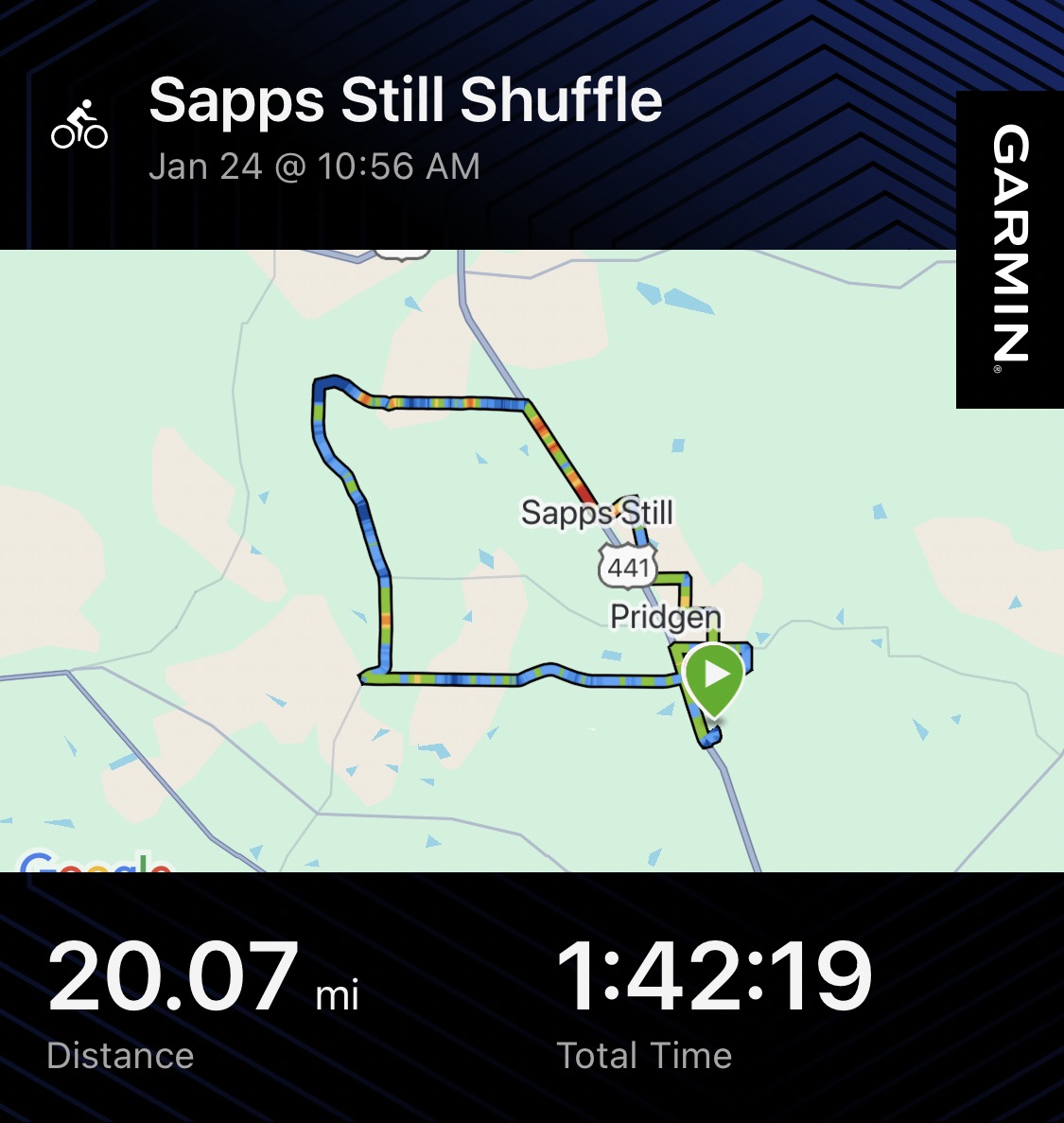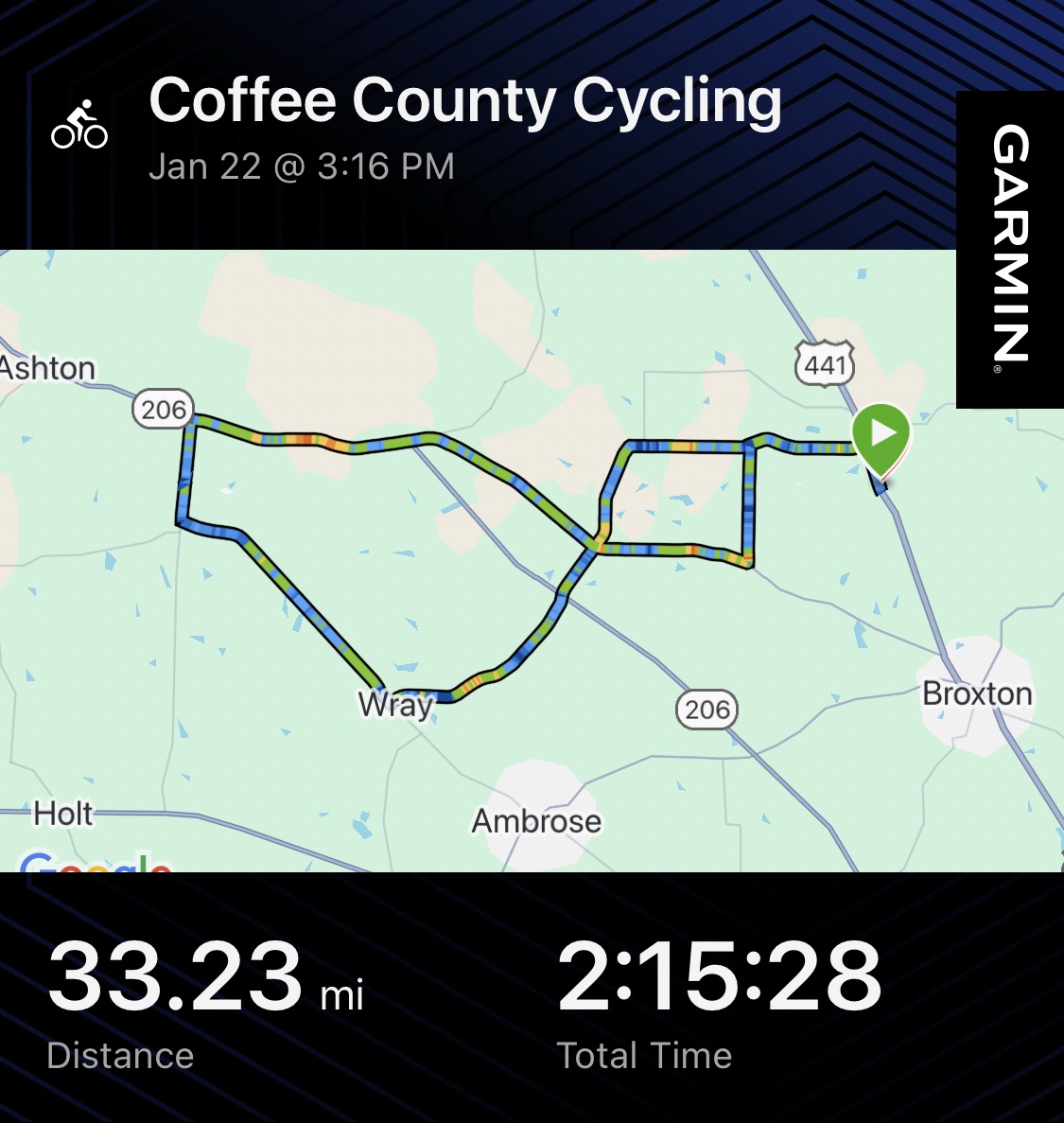 The second ride was on Friday and emphasized zone 2 endurance. I rode 53.65 miles over rolling terrain in 4:00:00. I rolled through Ambrose, GA, passing by a store front where in 2009 my family planted a church. Then I traveled to Douglas by way of Sinkhole Road. Once in Douglas, I grabbed a grilled chicken sandwich with a fruit cup on the side from Chick Fila. After lunch, I turned north and headed back home. Mentally, this ride was a chance to get in some decent miles for the week, and it reinforced the importance of consistency as the training volume slowly builds.